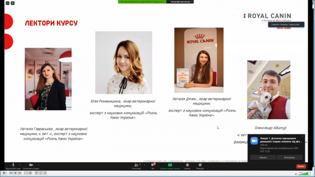В умовах адаптивного карантину та постійного зростання кількості хворих на Covid-19 необхідно зменшити кількість контактуючих людей, тому для опанування дисципліни було оперативно створено ЕНК на навчальному порталі Elearn «Дієтологія і утримання дрібних домашніх тварин», куди зараховані всі студенти, і систематично викладаються матеріали для освоєння навчального і практичного курсу. Заняття у студентів розпочалися з модуля «Дієтологія дрібних домашніх тварин». З метою надання студентам сучасної інформації з дисципліни ми запросили до співпраці фахівців провідних фірм, які займаються виготовленням і реалізацією кормів в Україні. Одними із перших відгукнулися експерти з наукових комунікацій компанії «Рояль Канін Україна».