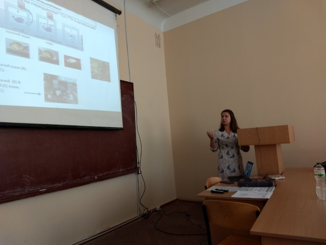 В.А. Гайченко, професор кафедри екології агросфери та екологічного контролю, д.б.н., професор, С.В. Хижняк, провідний науковий співробітник Української лабораторії якості і безпеки продукції агропромислового комплексу НУБіП України, д.б.н., професор, В.В. Іллєнко, старший викладач кафедри загальної екології, радіобіології та безпеки життєдіяльності, к.б.н., А.В. Клепко, в.о. завідувача кафедри загальної екології, радіобіології та безпеки життєдіяльності, к.б.н., с.н.с., І.М. Гудков, професор кафедри загальної екології, радіобіології та безпеки життєдіяльності, д.б.н., професор, В.М. Боголюбов, професор кафедри загальної екології, радіобіології та безпеки життєдіяльності, д.пед.н., професор, М.М. Лазарєв, доцент кафедри загальної екології, радіобіології та безпеки життєдіяльності, к.б.н., доцент, С.М. Грисюк, доцент кафедри загальної екології, радіобіології та безпеки життєдіяльності, к.с.-г.н., доцент, Л.Е. Піскунова, доцент кафедри загальної екології, радіобіології та безпеки життєдіяльності, к.с.-г.н., доцент, Л.І. Соломенко, доцент кафедри загальної екології, радіобіології та безпеки життєдіяльності, к.б.н., доцент, А.М. Кудрявицька, доцент кафедри загальної екології, радіобіології та безпеки життєдіяльності, к.с.-г.н., доцент, А.В. Сальнікова, старший викладач кафедри загальної екології, радіобіології та безпеки життєдіяльності, к.с.-г.н., І.В. Приймаченко, асистент кафедри загальної екології, радіобіології та безпеки життєдіяльності, О.В. Кашпарова, аспірант кафедри загальної екології, радіобіології та безпеки життєдіяльності, Я.В. Зінчеко, завідувач лабораторії, к.б.н. О.Ю. Паренюк, докторант кафедри загальної екології, радіобіології та безпеки життєдіяльності. Інші присутні на фаховому семінарі кафедри Загальної екології, радіобіології та безпеки життєдіяльності факультету Захисту рослин, біотехнологій та екології Національного університету біоресурсів і природокористування України: Л.Г. Калачнюк, професор кафедри біохімії і фізіології тварин імені академіка М.Ф. Гулого, д.б.н., професор; І.М. Курбатова, професор кафедри біології тварин, д.б.н., доцент; Хомутинін Ю.В., д.с.-г.н., старший науковий співробітник, головний науковий співробітник УкрНДІСГР НУБіП України; Левчук С.Є., к.б.н., провідний науковий співробітник УкрНДІСГР НУБіП України. Порядок денний: обговорення основних наукових результатів дисертації Кашпарової Олени Валеріївни на тему: «Експериментальне вивчення та математичне моделювання метаболізму 90Sr і 137Cs в організмі риб», поданоїна здобуття ступеня доктора філософії зі спеціальності 091 «Біологія». Дисертацію виконано на кафедрі Загальної екології, радіобіології та безпеки життєдіяльності факультету Захисту рослин, біотехнологій та екології Національного університету біоресурсів і природокористування України. Слухали: доповідь здобувача Кашпарової О.В. про основні положення дисертації, щодо дослідження динаміки накопичення та виведення радіонуклідів в організмі риб для отримання значень швидкості надходження з води (kw) чи з кормом (kf), а також виведення радіонуклідів з організму (kb) риб в природних умовах за різної температури води. Це має велике практичне значення для прогнозування динаміки радіоактивного забруднення риб в разі радіаційних аварій в різні пори року, а також розробки захисних заходів.