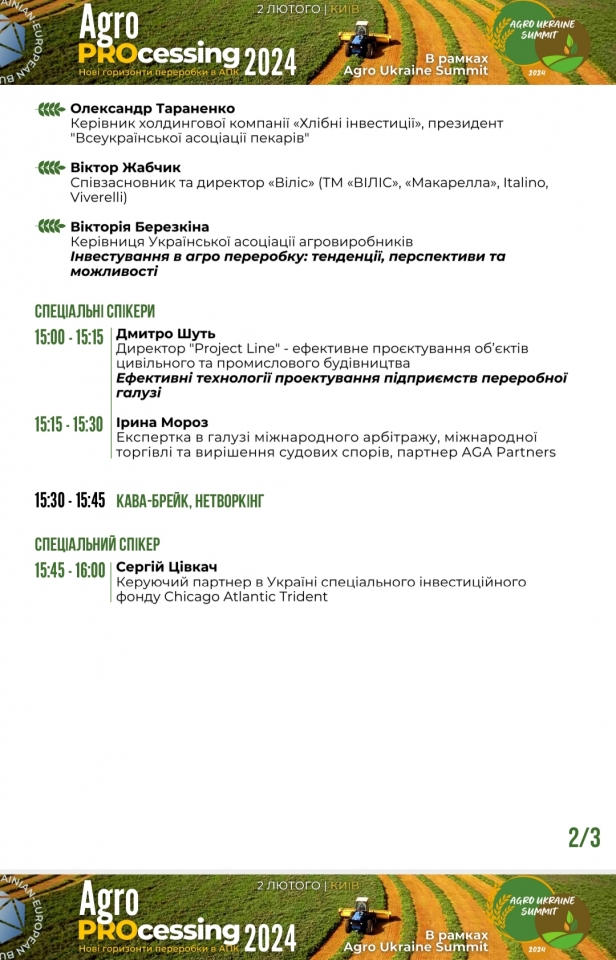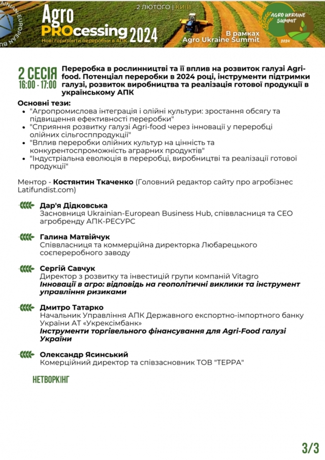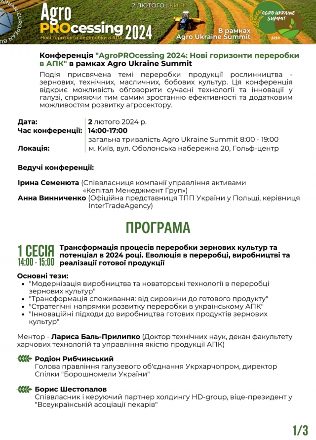 2 лютого відбудеться конференція «AgroPROcessing 2024: Нові горизонти переробки в АПК» в рамках великого Agro Ukraine Summit.