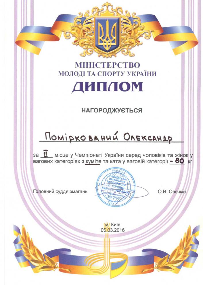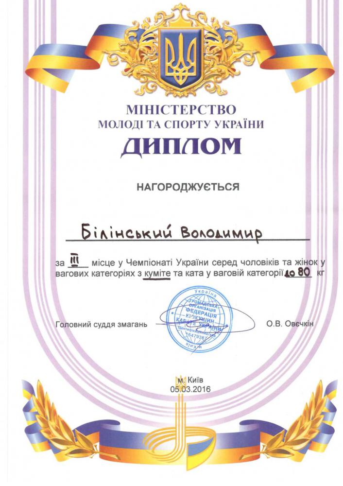 В котре студенти факультету тваринництва та водних біоресурсів змагались у такому Гордість факультету тваринництва та водних біоресурсів студенти Поміркований Олександр та Білінський Володимир – призери чемпіонату України з кіокушин карате виді спорту як кіокушин карате. На цей раз вони приймали участь і вибороли призові місця на відкритому чемпіонаті України серед чоловіків у категорії куміте (вагова категорія до 80 кг). Чемпіонат, що проходив 5 березня 2016 року в м. Києві зібрав спортсменів з усіх куточків країни. В ході змагань наш магістр Володимир Білінський і студент четвертого курсу Поміркований Олександр, вийшли у півфінал, де їм довелося зійтися у двобої один з одним. Цей бій був дружнім, але дуже важким і насиченим, за незначної переваги перемогу одержав Олександр, а Володимиру довелося битися за бронзу, і він її здобув. У фінальному поєдинку Олександр проявив мужність та витримку і виборов срібло.