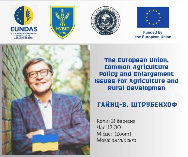 31 березня о 12:00 в рамках проєкту Erasmus+ напряму Жана Моне «Переговорна дипломатія ЄС і України в аграрній сфері» (101238685 — EUNDAS – ERASMUS-JMO-2025-HEI-TCH-RSCH) відбудеться гостьова лекція д-ра Гайнца-В. Штрубенхофа, міжнародного експерта проекту «Німецько-український агрополітичний діалог» (APD) на тему: «The European Union, Common Agriculture Policy and Enlargement Issues for Agriculture and Rural Development» (англійською мовою).