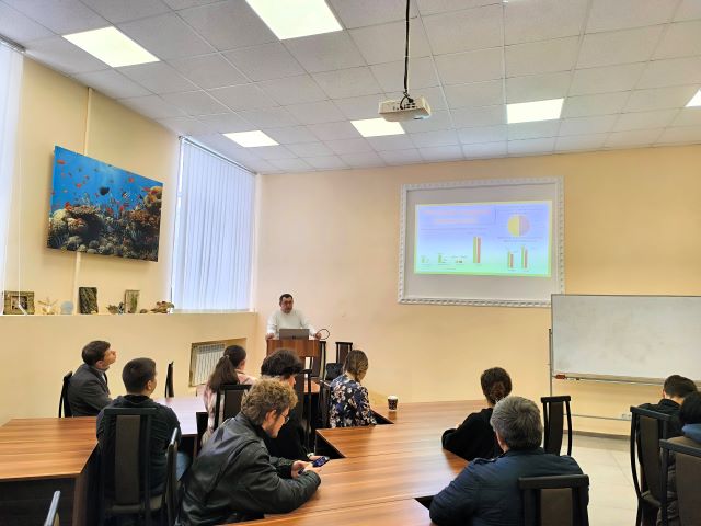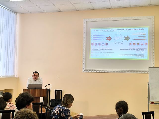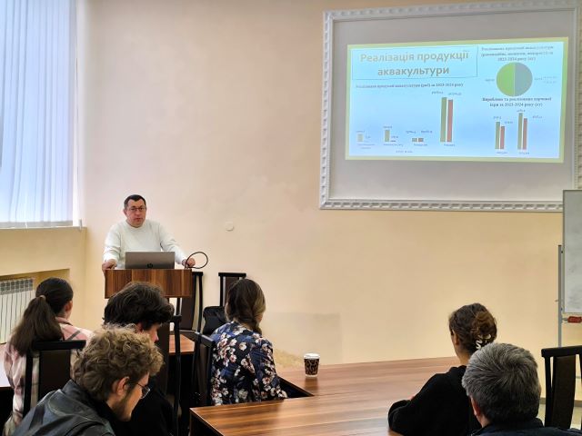 Під час виступу спікер ознайомив студентів з аналізом показників вироблення товарної рибної продукції та інших гідробіонтів за період 2023-2024 років. Відмічено зростання обсягів її вирощування, зокрема за рахунок розширення виробництва продукції ракоподібних в Україні. Крім того, було продемонстровано дані щодо масштабів реалізації виробленої продукції аквакультури за її видами. Інформація зацікавила учасників заходу, вони з неабияким інтересом ставили численні запитання, а Юрій Євгенійович дав їм вичерпні та професійні відповіді.