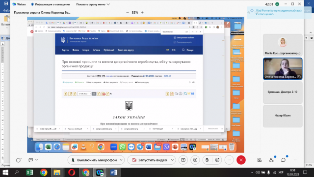 Розглянули нормативно- правові акти, що регулюють виробництво органічної продукції в Україні, акцентовано проговорили особливості законодавчого регулювання органічного тваринництва в Україні та світі.
