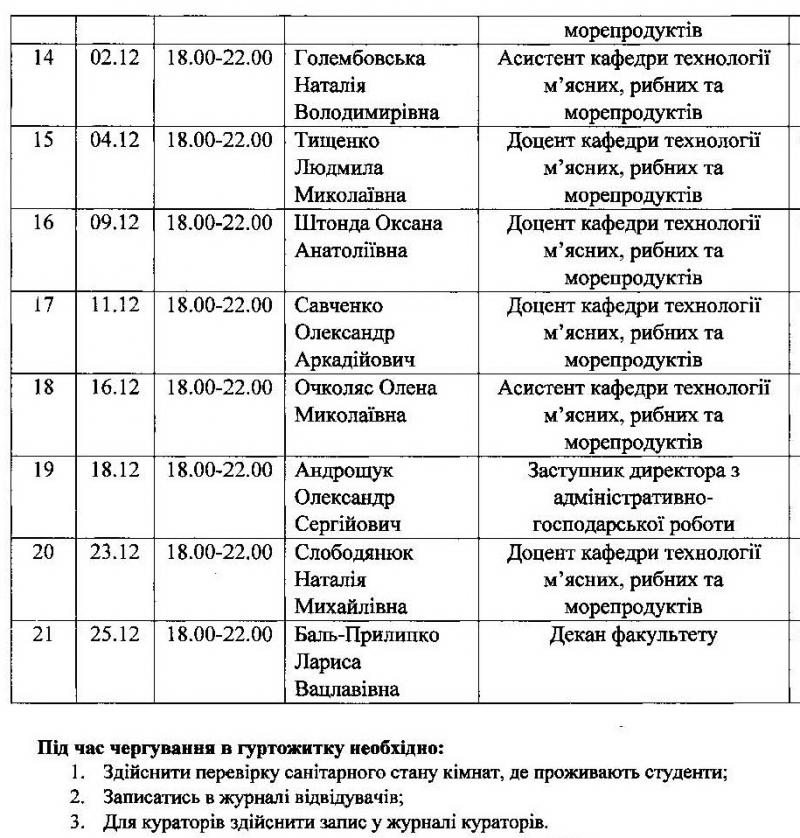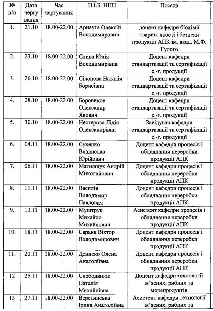 Графік чергування НПП у гуртожитку № 9 Графік чергування НПП факультету харчових технологій та управління якістю продукції АПК Гуртожиток № 9 21 жовтня 2014 року 03:00 - 03:00