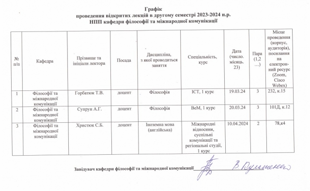 Графік проведення відкритих лекцій у ІІ семестрі 2023-2024 н.р.