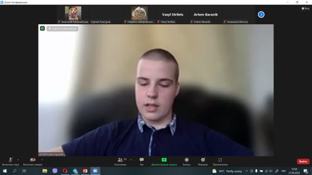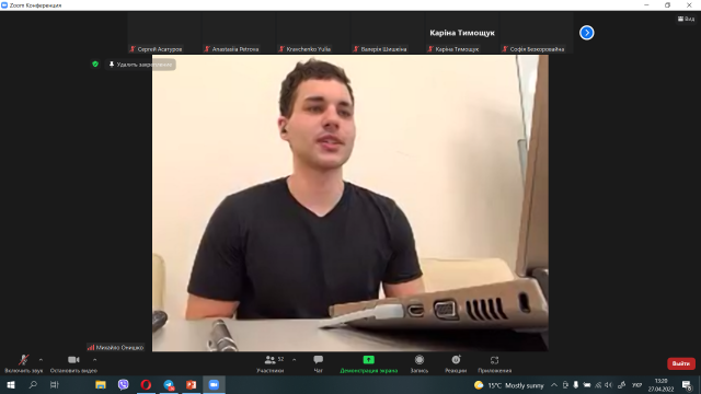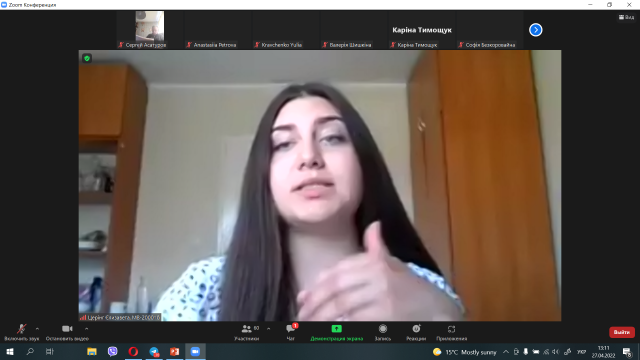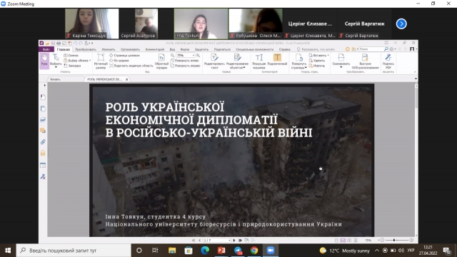 Розпочала дискусію виступом на тему: «Українська економічна дипломатія у російсько-українській війні» випускниця бакалаврату цього року групи МВ 18001 б, неодноразова учасниця Всеукраїнського конкурсу студентських наукових робіт, Всеукраїнського конкурсу студентських науково-популярних есе, що його проводиться під егідою Української Асоціації зовнішньої політики, студентка, для якої наукова робота стала неодмінною складовою навчання з перших кроків в Університеті, що вона має вже сьогодні біля десятка наукових та науково-популярних і публіцистичних публікацій, Товкун Інна.