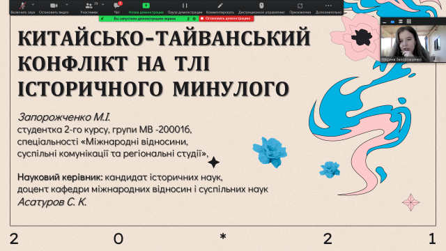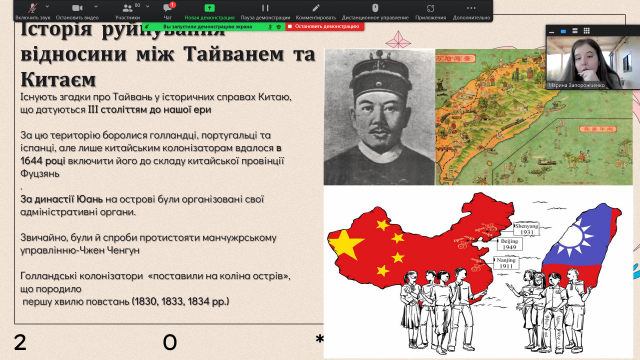 Другою слово взяла інша учасниця цьогорічного Всеукраїнського конкурсу студентських наукових робіт, неодмінна учасниця молодіжних наукових та інших заходів, включаючи міжнародні, бакалавр другого курсу групи МВ 20001 б Запорожченко Марина із виступом на тему: «Китай «частинка» Тайваню, чи Тайвань китайський острів? Історія проблеми та перспективи вирішення», що він привернув увагу присутніх полемічною постановкою питання та обґрунтованістю й зрілістю висновків.