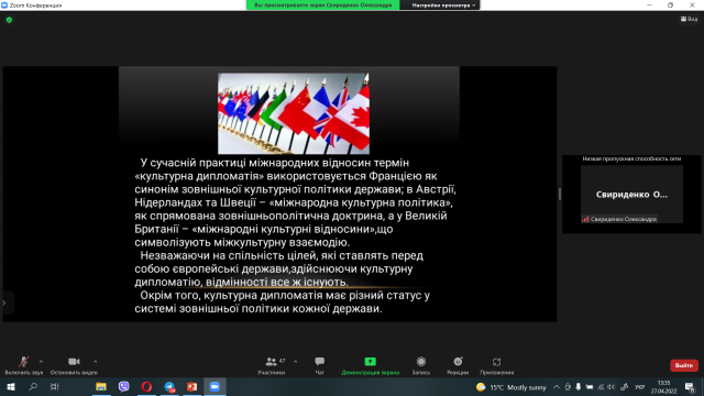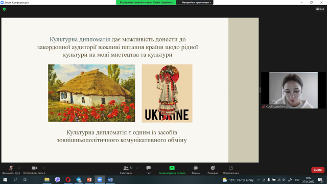 Чимало заявок на виступи було присвячено різним аспектам теми культурної дипломатії. На пленарному засіданні цій проблемі були присвячені виступи студентки І курсу групи МВ 21002 б Свириденко Олександри «Культурна дипломатія України у сучасних світових реаліях» та студентки ІІІ курсу групи МВ 19002 б Щербини Софії «Сучасна культурна дипломатія України: витоки, здобутки, перспективи».
