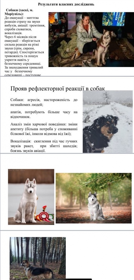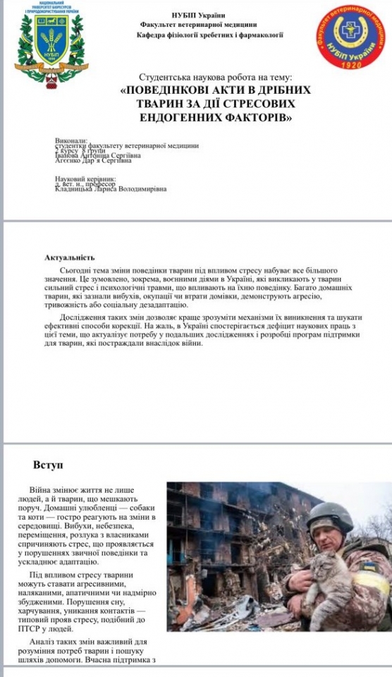 - Поведінкові акти в дрібних тварин за дії стресових ендогенних факторів (доповідачі: Іванова Антоніна Сергіївна, Агєєнко Дар’я Сергіївна (2 курс, 8 група), науковий керівник: Кладницька Лариса Володимирівна, доктор ветеринарних наук, професор. Науковий гурток: Фізіологія тварин);