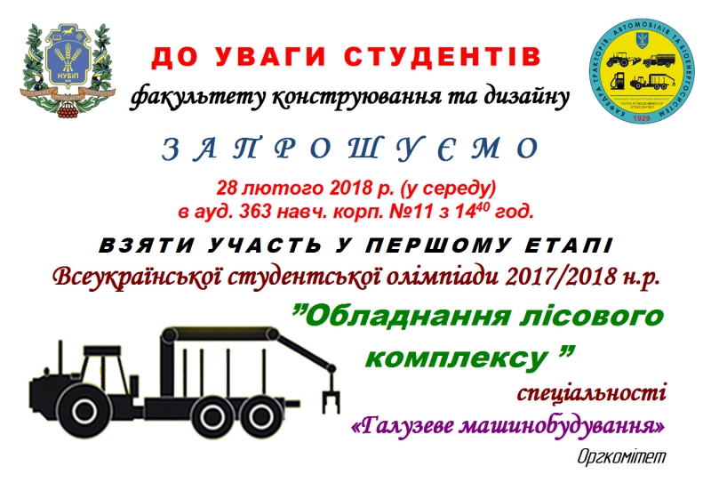 Запрошуємо студентів факультету конструювання та дизайну 28 лютого 2018 р. (у середу) в ауд. 363 навч. корп. №11 з 14.40 год. взяти участь у першому етапі Всеукраїнської студентської олімпіади 2017-2018 н.р. з ”Обладнання лісового комплексу” спеціальності «Галузеве машинобудування».