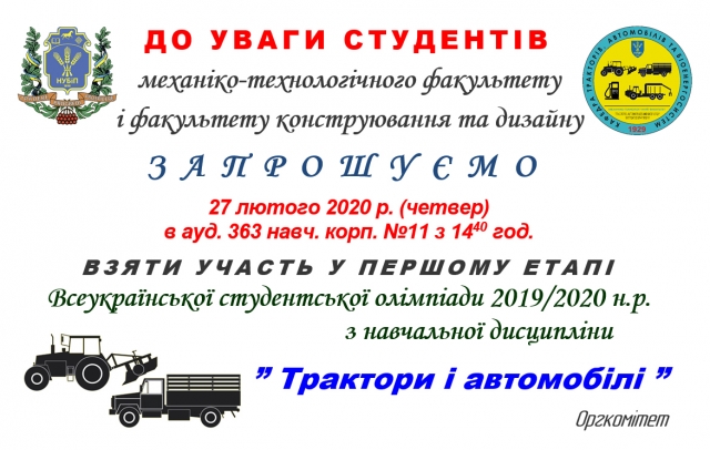 Запрошуємо студентів факультету конструювання та дизайну і механіко-технологічного факультету 27 лютого 2020 р. (у четвер) в ауд. 363 навч. корп. №11 з 14.40 год. взяти участь у першому етапі Всеукраїнської студентської олімпіади 2019/2020 н.р. з навчальної дисципліни "Трактори і автомобілі" ("Основи конструкцій мобільних енергетичних засобів").