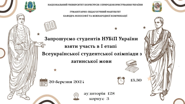 Кафедра філософії та міжнародної комунікації гуманітарно-педагогічного факультету запрошує студентів НУБІП України до участі в І етапі Всеукраїнської студентської олімпіади з латинської мови