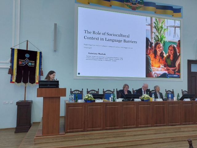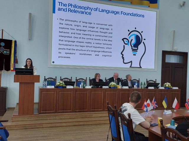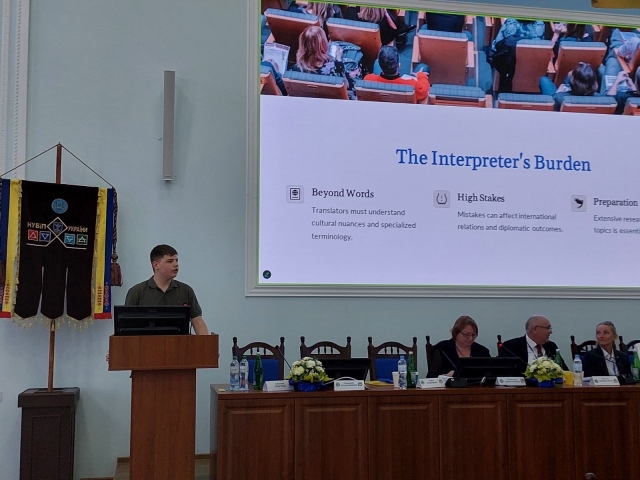 Наукову естафету перейняли здобувачі вищої освіти першого і другого освітніх рівнів, які спрезентували результати власних досліджень англійською мовою: Мар'яна Білошапка («Philosophy of language and its role in intercultural understanding»), Вадим Горовий («Role of translators in international relations: challenges and solutions»).