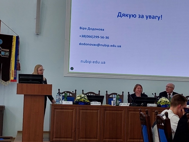Доктор філософських наук, професор, професор кафедри філософії та міжнародної комунікації НУБіП України Віра Додонова тримала доповідь на тему: «Міжкультурна комунікація у фокусі діалогу українських та європейських цінностей», зазначивши, що міжкультурна комунікація як двосторонній процес передбачає наявність толерантного ставлення і прагнення до взаєморозуміння всіх учасників спілкування. У процесі міжкультурної комунікації цінності спрацьовують як моральний імператив, відіграючи важливу роль та уможливлюючи її повноцінність. Міжкультурна комунікація реалізується на рівні індивідуальних і суспільних цінностей, які перетинаються між собою та створюють ціннісно-смисловий комплекс. Особливості європейської цивілізації проявляються в створеній системі цінностей, які пройшли складний шлях трансформації та домінують в цивілізованому світі, а спорідненість цінностей України та Європи вказує на спорідненість ідеалів, культур, які роблять Україну невід’ємною частиною європейського товариства.