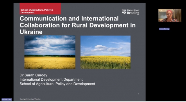 Доктор Сара Карді, доцент, директор Школи міжнародного партнерства та рекрутингу, старший науковий співробітник, директор магістерських програм Communication for Development, Applied International Development Університету Редінгу (Велика Британія) виступила з доповіддю «Комунікація та міжнародна співпраця для розвитку сільських територій в Україні».