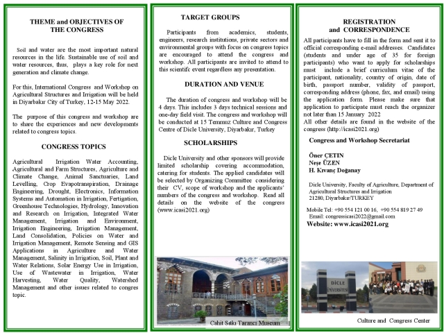 Конгрес і семінар відбудуться в місті Діярбакір (Туреччина), де за всю історію проживали 33 різні цивілізації. І це одне з найбільших міст Туреччини, яке виділяється своєю історією, культурою, сільським господарством, їжею та релігійним туризмом. Всю детальну інформацію можна знайти на сайті конгресу (www.icasi2021.org). Конгрес і семінар охоплює питання сільськогосподарського зрошення, посухи, зміни клімату, використання стічних вод, екологічних проблем, дистанційного зондування в сільськогосподарському зрошенні та розумних системи, а також всі інші суміжні питання та теми сільськогосподарських споруд та зрошення.