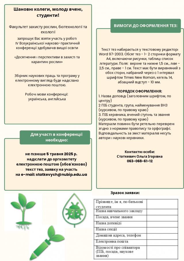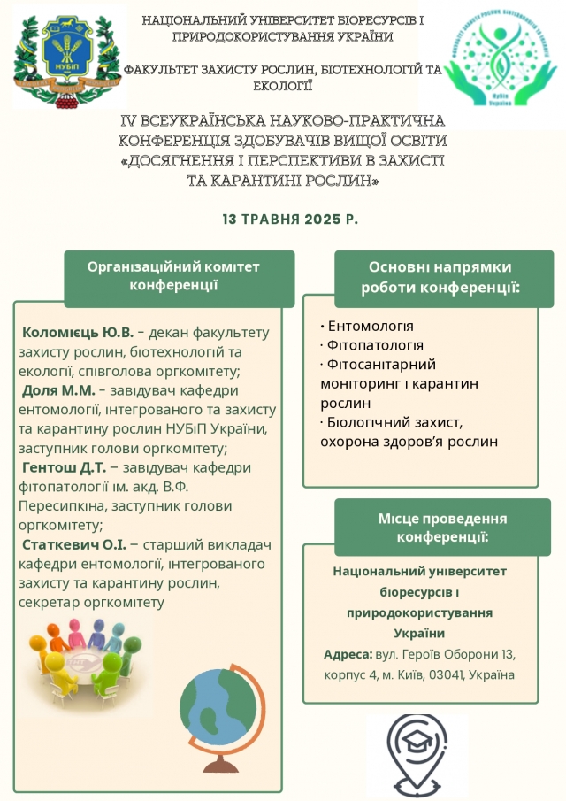 Запрошуємо Вас взяти участь у IV Всеукраїнській науково-практичній конференції здобувачів вищої освіти «Досягнення і перспективи в захисті та карантині рослин», яка відбудеться 13 травня 2025 року.
