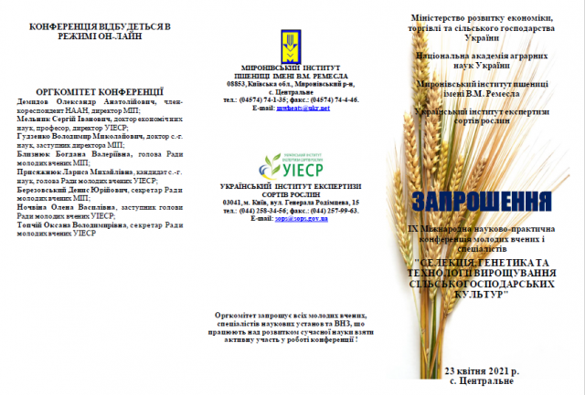 23 квітня 2021 р. на базі Миронівського інституту пшениці імені В. М. Ремесла. Конференція відбудеться в режимі он-лайн