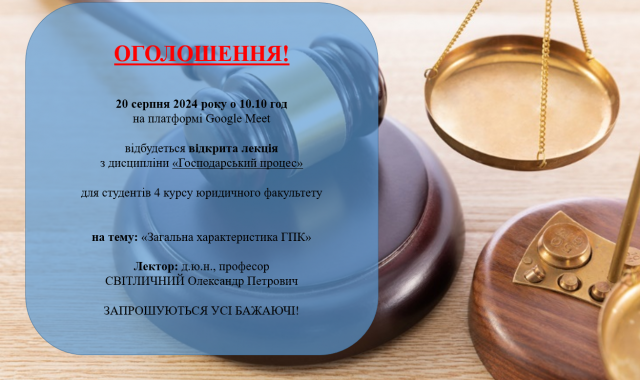 Запрошуємо долучитися до відкритої лекції професора кафедри цивільного та господарського права
