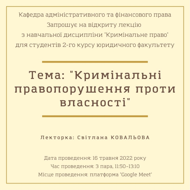 Кафедра адміністративного та фінансового права запрошує на відкриту лекцію Світлани Ковальової Приєднатися - https://meet.google.com/gcj-rpam-dah Normal 0 false false false EN-US X-NONE X-NONE 9 травня 2022 року 03:00 - 03:00