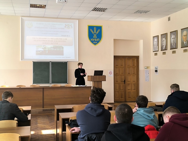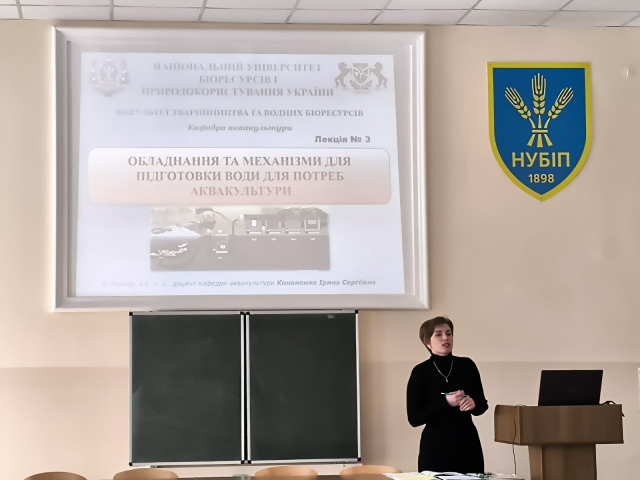 Відповідно до графіку проведення відкритих занять на факультеті тваринництва та водних біоресурсів 26 лютого доцентом кафедри аквакультури, к.с.-г.н. Іриною КОНОНЕНКО для студентів 3 курсу ОС «Бакалавр» спеціальності 207 «Водні біоресурси та аквакультура» було проведено відкриту лекцію на тему «Обладнання та механізми для підготовки води для потреб аквакультури» з дисципліни «Гідротехніка та технічні засоби в аквакультурі».