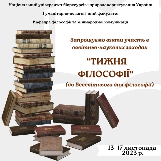 Кафедра філософії та міжнародної комунікації НУБІП України запрошує взяти участь в освітньо-наукових заходах в рамках проведення "Тижня філософії" до Всесвітнього дня філософії