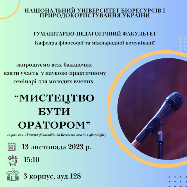 Кафедра філософії та міжнародної комунікації НУБІП України запрошує взяти участь у науково-практичному семінарі «Мистецтво бути оратором» в рамках «Тижня філософії» до Всесвітнього дня філософії