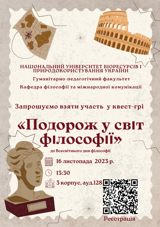 Кафедра філософії та міжнародної комунікації НУБІП України запрошує взяти участь у науково-практичному семінарі "Подорож у світ філософії" в рамках "Тижня філософії " до Всесвітнього дня філософії