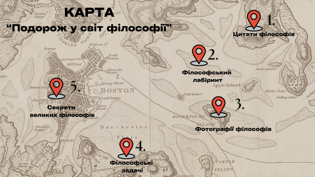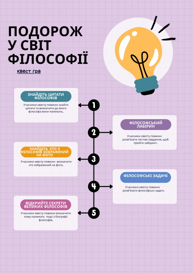 Метою квест-гри: є висвітлення філософського світоглядного освоєння людиною дійсності, історією виникнення і розвитку філософських ідей, із філософськими концепціями, основними теоретичними проблемами філософії та її поняттєвим апаратом. Виховання сучасної компетентної особистості на основі гуманістичних ідеалів, національних, демократичних та громадянських цінностей.