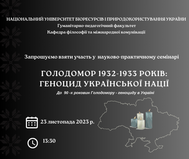 Кафедра філософії та міжнародної комунікації НУБІП України запрошує взяти участь у науково-практичному семінарі «Голодомор 1932-1933 р: геноцид української нації» до 90-х роковин Голодомору - геноциду в Україні