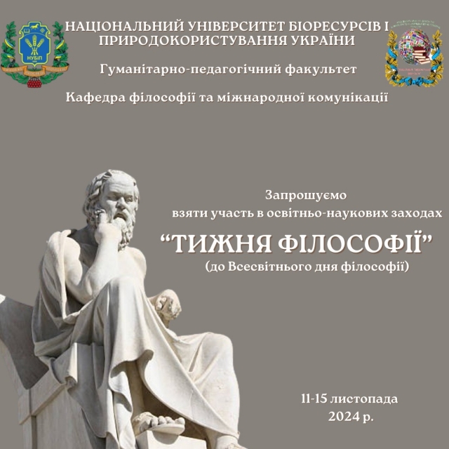 Кафедра філософії та міжнародної комунікації НУБІП України запрошує взяти участь в освітньо-наукових заходах в рамках проведення "Тижня філософії" до Всесвітнього дня філософії