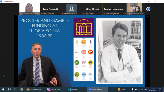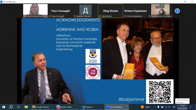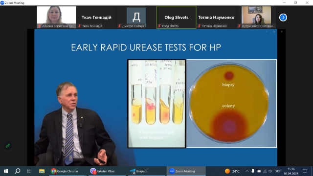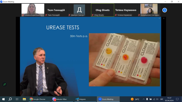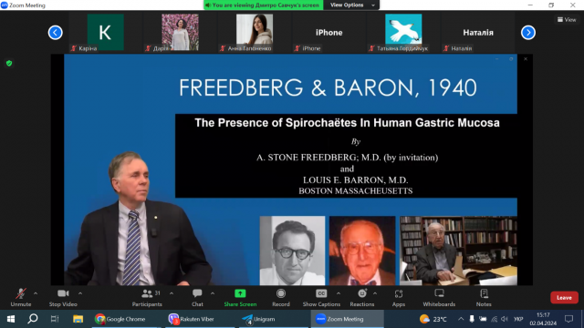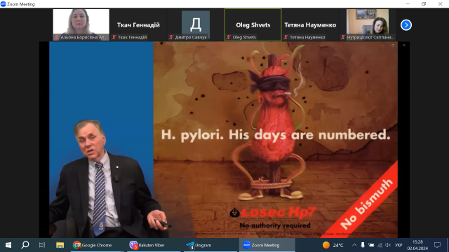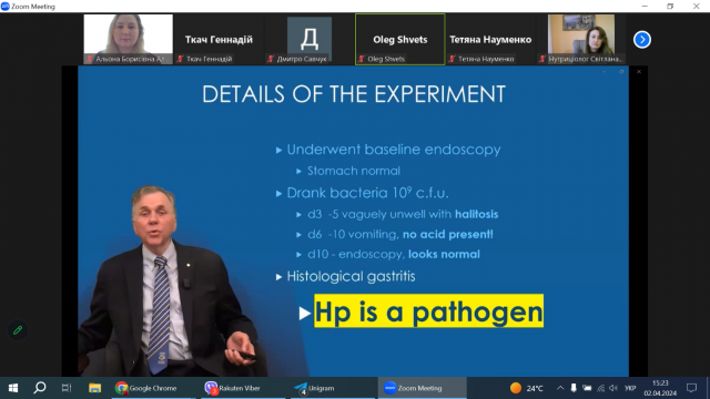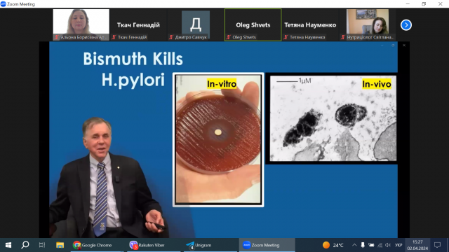 Анонсуючи виступ Баррі Маршалла, завідувач кафедри громадського здоров’я та нутриціології Олег Швець звернувся до учасників вебінару зі словами про важливість відкриття Helicobacter pylori для людства та проханням не тільки уважно прослухати цікаву доповідь науковця, але й бути активними – задавати питання, долучатись до обговорення, висловлюватись щодо проблем, які вони бачать пріоритетними у розвитку нутриціології, а найголовніше – спробувати дати власну відповідь на питання «Як отримати Нобелівську премію?»