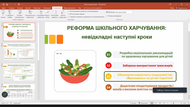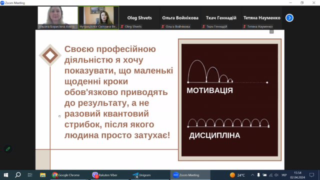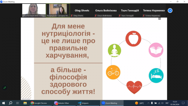 Магістрантка Ольга Зінченко висловила своє ставлення до піднятих тем і зазначила, що проблеми здорового харчування потрібно вирішувати комплексно, враховуючи психологічну складову.