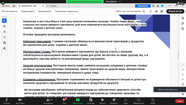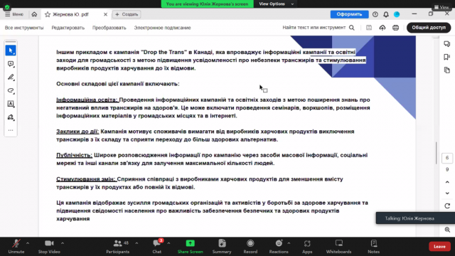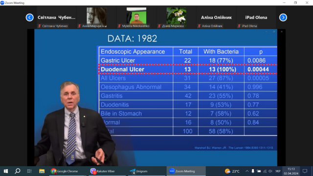 До обговорення наукової доповіді долучились студенти факультету харчових технологій та управління якістю продукції АПК під модераторством доцента кафедри Альони Альтанової. Учасники вебінару цікавились, зокрема, лікувально-діагностичними аспектами теми доповіді, запитували думку щодо окремих тез Баррі Маршалла професора Олега Швеця, який, до речі, є не тільки Президентом Асоціації дієтологів України, а й Членом Президії Української гастроентерологічної асоціації.
