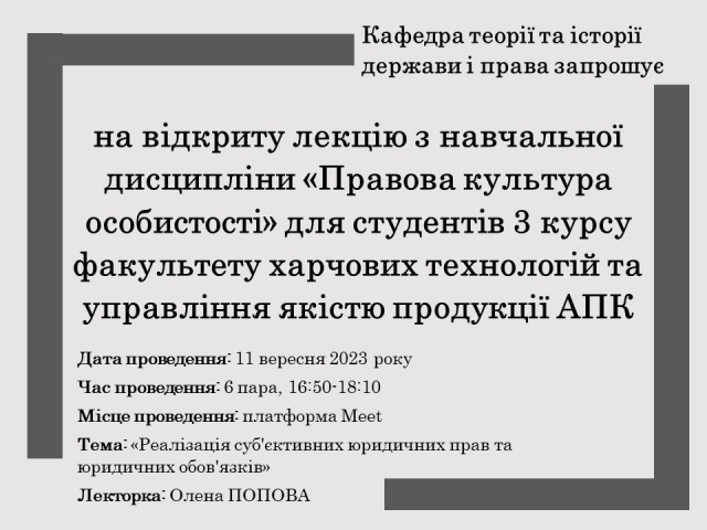 Кафедра теорії та історії держави і права запрошує на відкрите лекційне заняття Приєднатися http://meet.google.com/upf-pbfw-mcp 4 вересня 2023 року 03:00 - 03:00