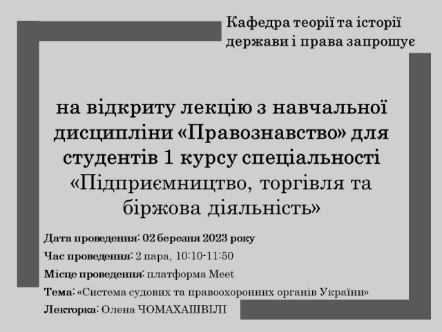 Кафедра теорії та історії держави і права запрошує на відкрите лекційне заняття Приєднатися можна за покликанням: https://meet.google.com/vea-hxnb-cfz 24 лютого 2023 року 02:00 - 02:00
