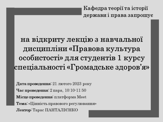 Кафедра теорії та історії держави і права запрошує на відкрите лекційне заняття Приєднатися можна за покликанням: https://meet.google.com/nzy-wugo-bio 17 лютого 2023 року 02:00 - 02:00