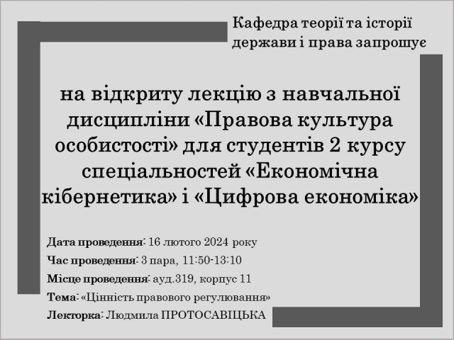 Кафедра теорії та історії держави і права запрошує на відкрите лекційне заняття 11 лютого 2024 року 02:00 - 02:00