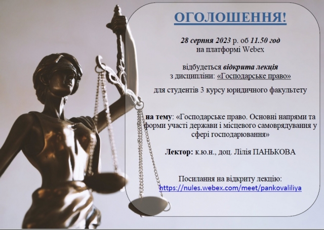 Кафедра цивільного та господарського права запрошує на відкриту лекцію з дисципліни "Господарське право"