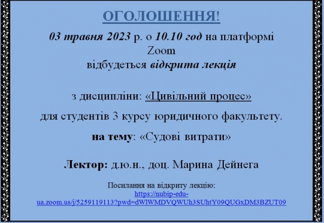 Кафедра цивільного та господарського права запрошує на відкриту лекцію з дисципліни "Цивільний процес"