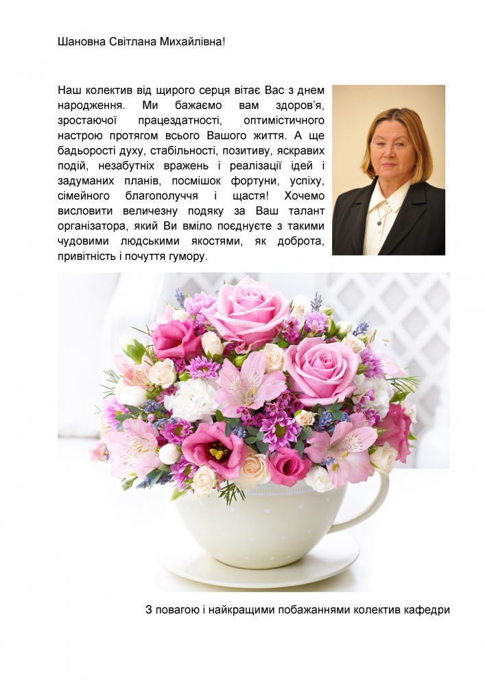 Колектив кафедри вітає з Днем народження професора КАЛЕНСЬКУ Світлану Михайлівну! 23 лютого 2019 року 10:00 - 10:00