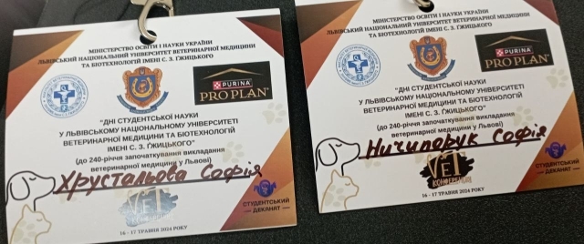 Здобувачі вищої освіти факультету ветеринарної медицини, представники студентських наукових гуртків «Ветеринарна вірусологія» Ничипорук Софія (4 курс) та «Ветеринарна мікробіологія» Хрустальова Софія у (2 курс) у супроводі наукових керівників професора Радзиховського М.Л. та доцентки Дишкант О.В. кафедри епізоотології, мікробіології і вірусології, з 16 по 17 травня прийняли участь у студентській конференції «Дні студентської науки у Львівському національному університеті ветеринарної медицини та біотехнології імені С.З. Гжицького» присвяченій 240-річчю започаткування викладання ветеринарної медицини у Львові.