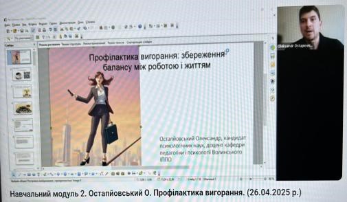 Модуль також охоплював важливі аспекти профілактики професійного вигорання, про які доповідав Олександр ОСТАПЙОВСЬКИЙ, кандидат психологічних наук, доцент кафедри педагогіки і психології Волинського інституту післядипломної педагогічної освіти. У своєму виступі він підкреслив необхідність збереження балансу між професійною діяльністю та особистим життям як ключового чинника психоемоційного благополуччя викладача. Значний акцент було зроблено на мотивації здобувачів освіти, підвищенні їхнього пізнавального інтересу та активному залученні до освітнього процесу. Завершився модуль розглядом психологічних особливостей дистанційного навчання — його переваг, труднощів, а також панельною дискусією, присвяченою обміну практичним досвідом.