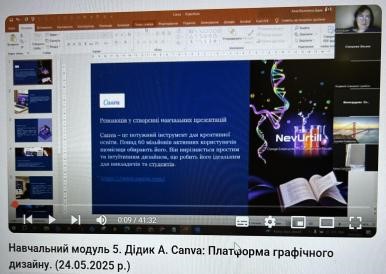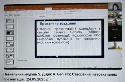 П’ятий навчальний модуль міжнародного стажування зосередився на цифрових технологіях у викладанні з особливим акцентом на візуалізацію навчальних матеріалів. Заняття проводили Оксана СТЕПАНЮК та Аліна ДІДИК, які надали учасникам практичні знання та навички щодо створення якісного візуального контенту для освітнього процесу. Учасники опановували інструменти дизайну за допомогою таких платформ, як Canva та Trello, що дозволило ефективно організовувати навчальні матеріали та підвищувати їхню привабливість. Особливу увагу було приділено створенню візуальних матеріалів для дистанційного навчання із використанням PowerPoint, Prezi та Mentimeter, що є важливим чинником для утримання уваги здобувачів освіти в онлайн-середовищі. У рамках цього модуля учасники продовжили активно знайомитися з різноманітними сучасними освітніми платформами. Особливу увагу було приділено поглибленому опрацюванню можливостей таких інструментів, як Miro, LiveWorksheets, Kahoot та WizerMe. Ці ресурси відкривають широкі можливості для створення інтерактивних завдань, гейміфікованих уроків і спільних віртуальних просторів. Використання таких платформ суттєво оживлює освітній процес, сприяє активній участі студентів та робить навчання більш залученим, творчим і ефективним.