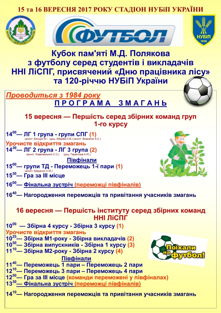 Кубок пам'яті М.Д. Полякова з футболу серед студентів і викладачів ННІ ЛіСПГ, присвячений «Дню працівника лісу» та 120-річчю НУБіП України 14 вересня 2017 року 03:00 - 03:00