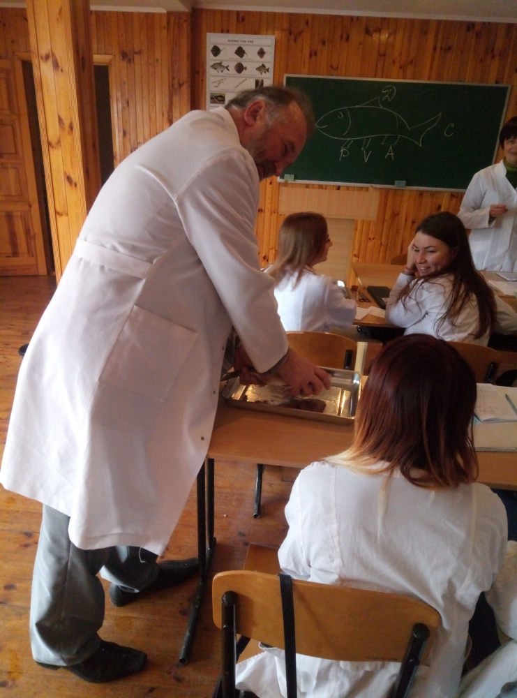 28 жовтня 2016 року кафедрою гідробіології та іхтіології (викладачі Шевченко П.Г. – завідувач кафедри, Цедик В.В. – доцент кафедри, Халтурин М.Б. – асистент кафедри) на базі ННВЛ рибництва ВП НУБіП України Немішаєвський ДАК було проведено лабораторне заняття для студентів 3 курсу факультету тваринництва та водних біоресурсів за спеціальністю «Водні біоресурси та аквакультура» з іхтіології.
