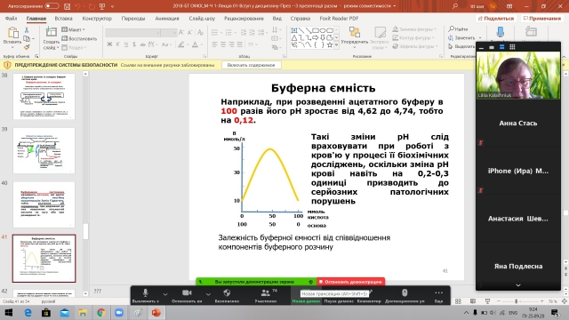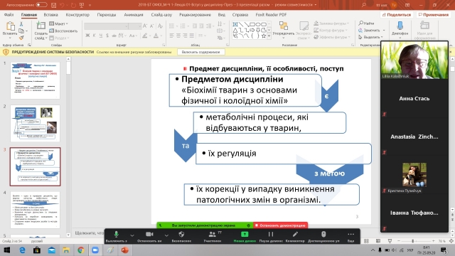 Студентам ІІ потоку (4-7 групи), ІІ курсу факультету ветеринарної медицини 25 вересня 2020 року була прочитана лекція з дисципліни «Біохімія тварин з основами фізичної і колоїдної хімії» (БТ ОФКХ) on-line на платформі Zoom. Лекція висвітлювала теми вступу в дисципліну БТ ОФКХ (ч.1) і основи фізичної хімії (рН і буферні розчини). Після представлення презентацій лекцій та за використання бази питань контролю електронного навчального курсу БТ ОФКХ (Ч. 1) були закріплені найосновніші елементи засвоєного матеріалу з основ фізичної біохімії.