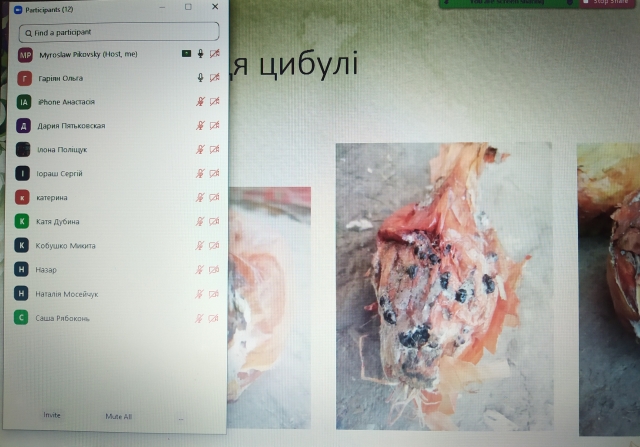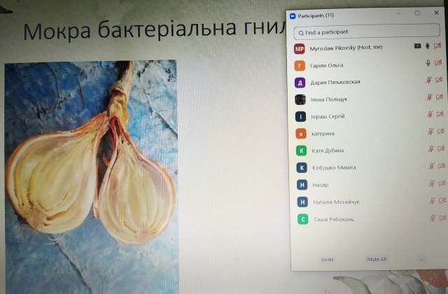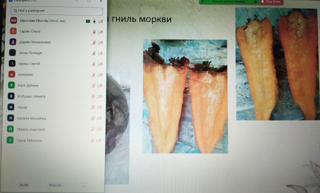 У форматі відеоконференції нами проведено семінар на якому акцентовано увагу щодо діагностики хвороб овочевих культур у період зберігання продукції. Студентка 4-го курсу освітньо-професійної програми «Захист і карантин рослин» Ольга Гаріян за результатами власної роботи зібрала та діагностувала хвороби коренеплодів моркви, бульб картоплі, зразків цибулі та часнику. Представлена нею змістовна та цікава доповідь викликала жваву дискусію, результатом котрої було уточнення симптоматики патологій та достовірної діагностики хвороб.