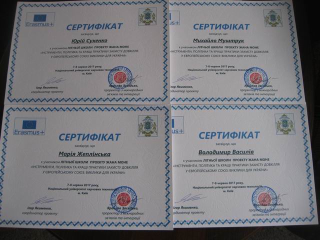 Викладачі кафедри процесів і обладнання переробки продукції АПК - завідувач кафедри, професор Сухенко Ю.Г. та доценти кафедри Василів В.П, Жеплінська М.І., Муштрук М.М мали честь відвідати 7 та 8 червня 2017 р Літню школю у Національному університеті харчових технологій у рамках реалізації проекту Жан Моне Модуль EcoPro (№ 574796-EPP-1-2016-1-UA-EPPJMO-MODULE). «Інструменти, політика та кращі практики захисту довкілля у Європейському Союз: виклики для України» - така тема цього заходу відбулася за участі представників виробництва, державних органів влади та місцевого самоврядування, представників громадських організацій, викладачів, дослідників та студентів.