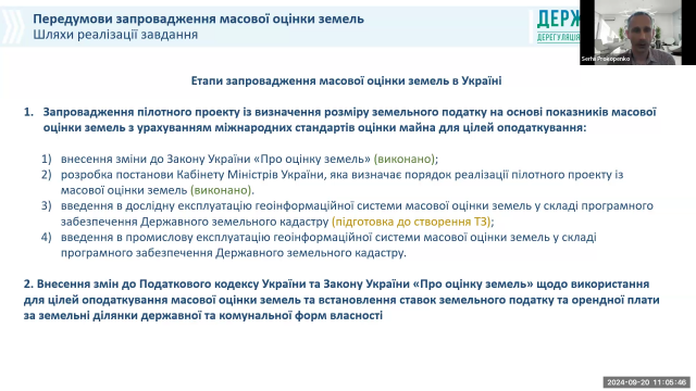 Начальник відділу оцінки земель Держгеокадастру Сергій Прокопенко поділився досвідом впровадження пілотного проекту з масової оцінки землі в Україні. Він підкреслив, що цей проект стане важливим інструментом для ефективного управління земельними ресурсами та справедливого оподаткування.